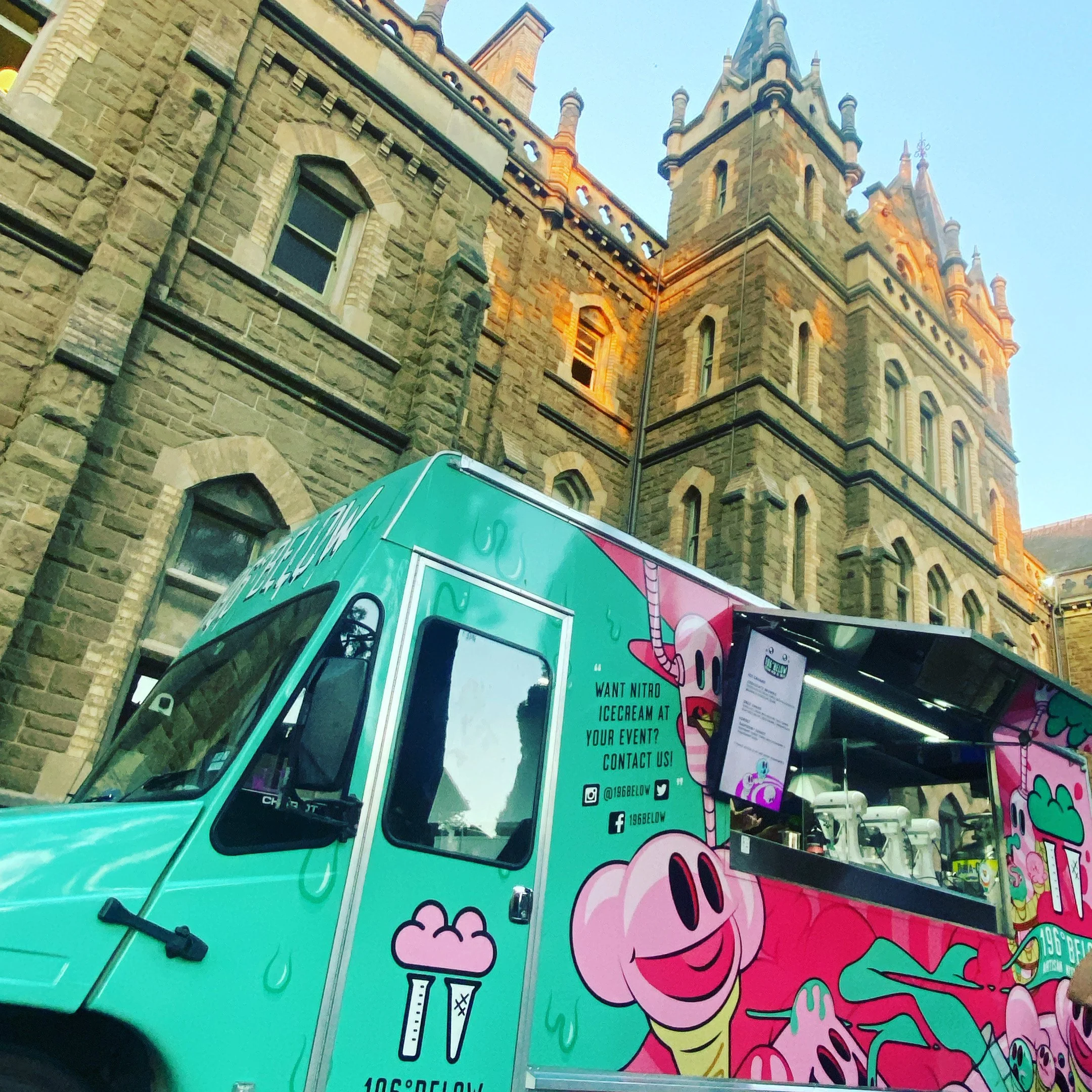 A colorful ice cream truck park in front of a historic stone building with towers and arched windows.